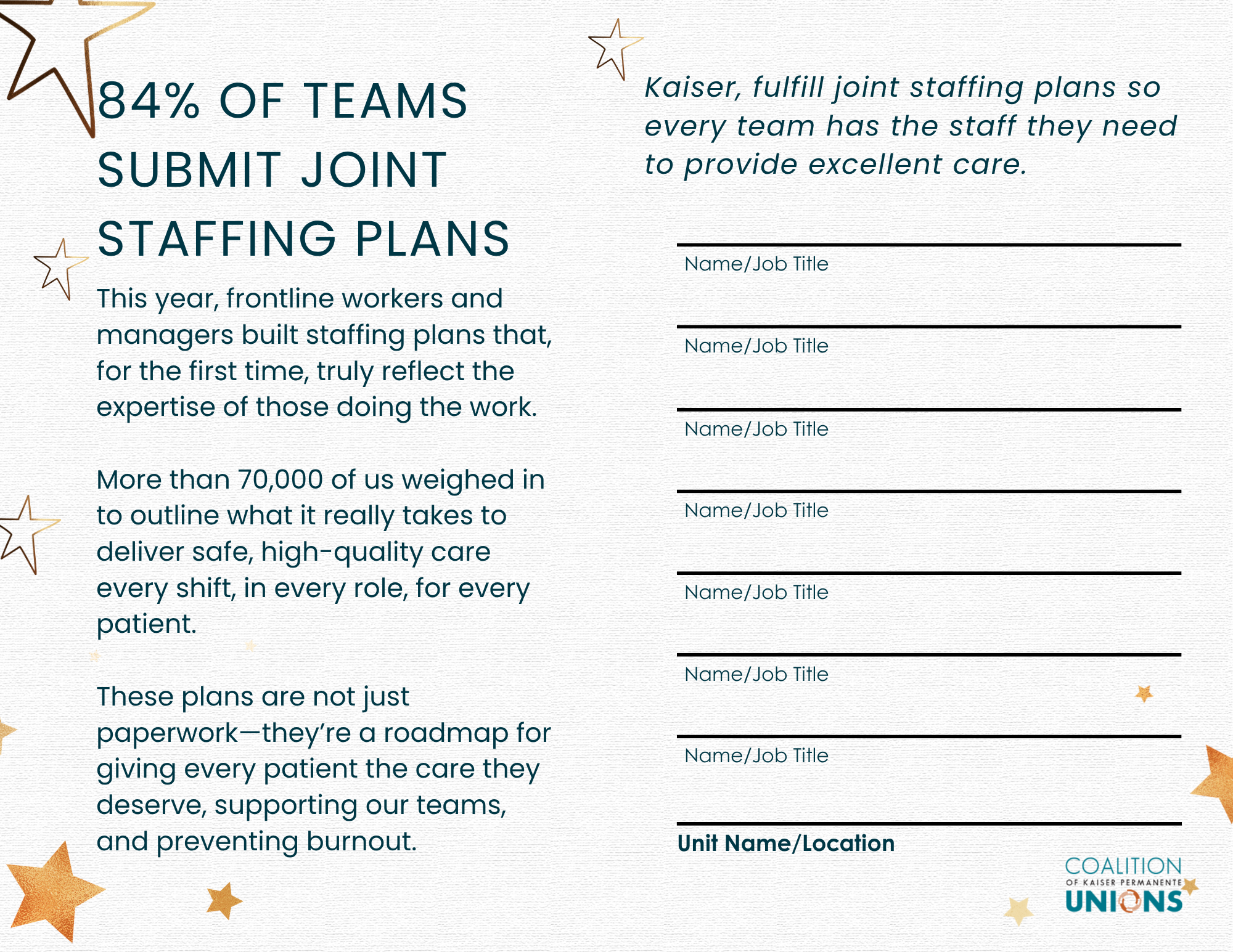 For the first time ever, over 70,000 frontline voices are on record about the staffing we need for our patients. 84% of teams have submitted joint staffing plans. These plans are a roadmap to giving every patient the care they deserve. They’re designed to prevent burnout by addressing the root causes of short staffing, rather than just treating the symptoms. And these plans came from frontline expertise — from the people who know the work best — and they’re the key to creating lasting change.