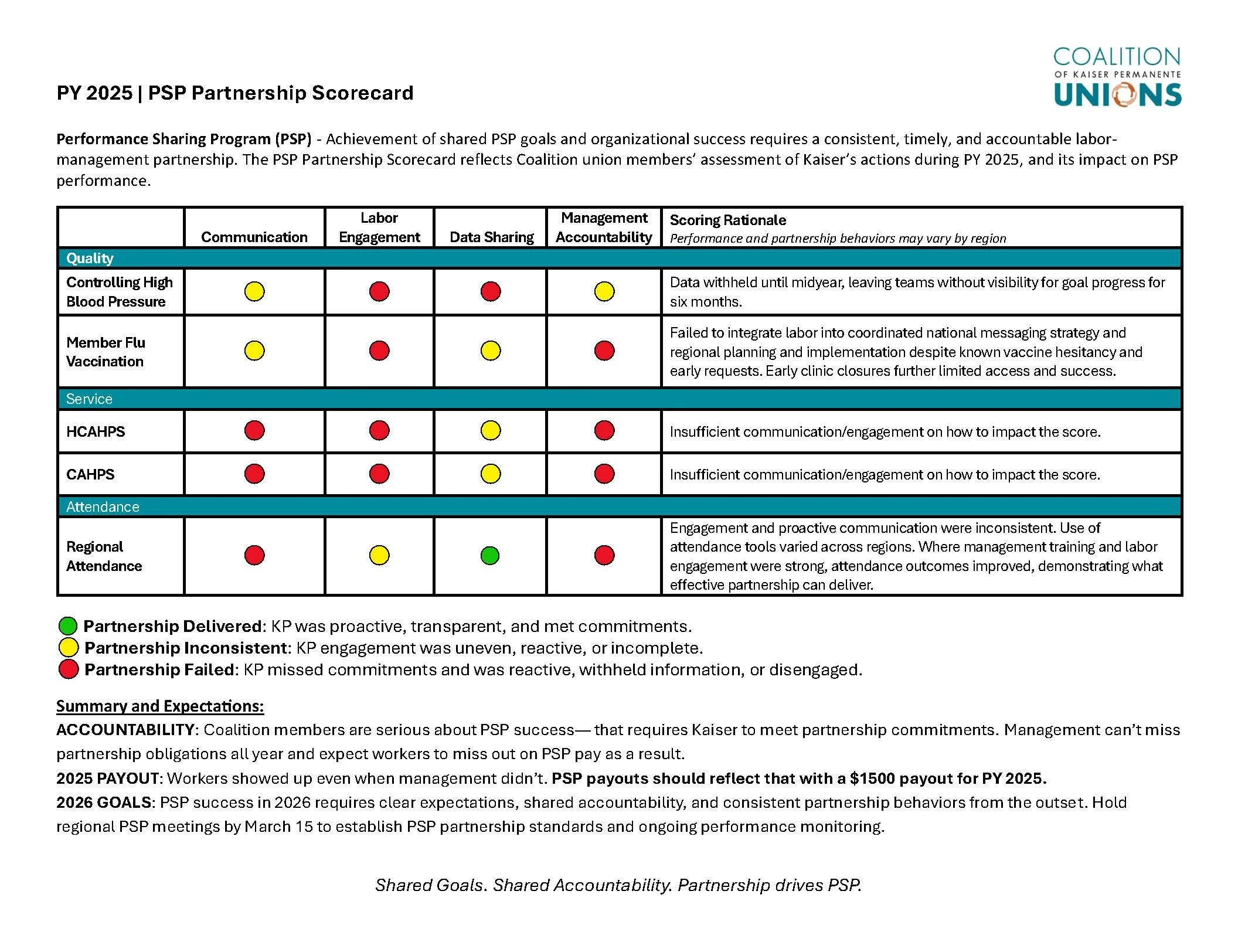 All year, Kaiser used a scorecard to measure PSP goals. Now we’re turning the scorecard around to evaluate how Kaiser partnered with us on each goal—and demanding a $1500 payout for 2025.