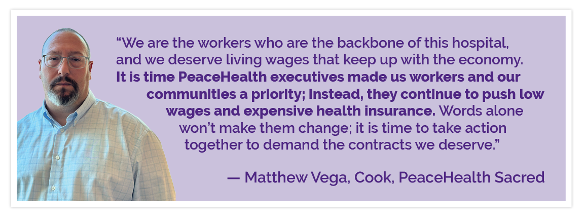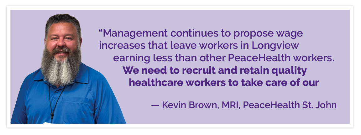 Caregivers across PeaceHealth—from Sacred Heart to St. John—are standing together for one standard of care. We’re united for fair pay, affordable healthcare, and strong job protections—because when every PeaceHealth worker is respected and supported, we can provide the best possible care for every patient in our communities.