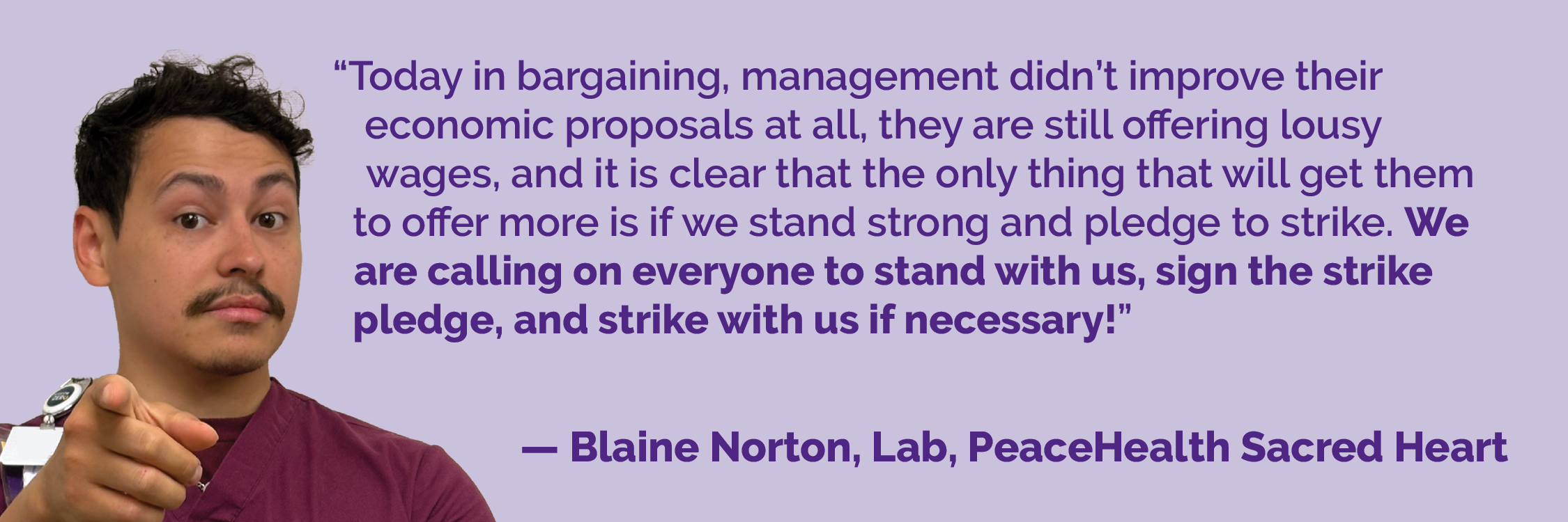 PeaceHealth is still offering across-the-board increases of just 3%, 2.5% and 2.75%, with no minimum pay rate, nothing to increase ghost steps, zero limits or reductions in costs for healthcare, and shift pay takeaways.